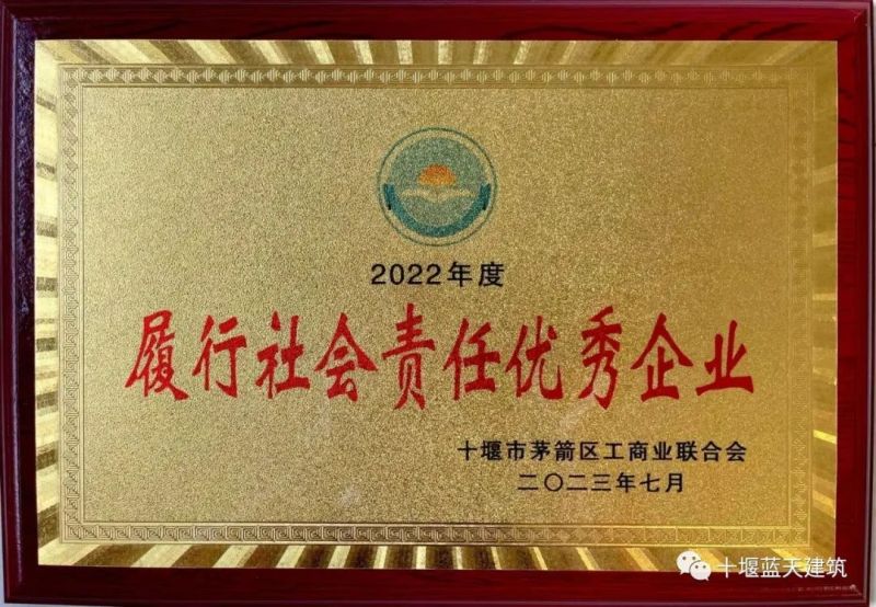 藍天建筑獲得“茅箭區(qū)履行社會責任優(yōu)秀企業(yè)”榮譽稱號